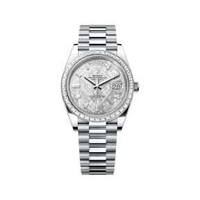 表盘设有10颗方形切割钻石。金属陨石是数百万年前爆炸的小行星,它们来自太阳系遥远的地方。这种主要由铁和镍组成的天然外星物质碎片,在宇宙航行中,每百万年冷却若干摄氏度,从而在内部产生在地球上无法形成的独特结晶。金属陨石的加工难度高且具挑战性,但是一旦将其切成薄片并进行化学处理,就可以看出其内部结构美丽的交织层次。这些引人入胜的变化形式被称为维德曼交角花纹(Widmanstätten)。劳力士与权威专家合作,设计制造表盘,仅选择具有优美形状和富有反光层面的陨石。表盘设有10颗方形切割钻石。金属陨石是数百万年前爆炸的小行星,它们来自太阳系遥远的地方。这种主要由铁和镍组成的天然外星物质碎片,在宇宙航行中,每百万年冷却若干摄氏度,从而在内部产生在地球上无法形成的独特结晶。 金属陨石的加工难度高且具挑战性,但是一旦将其切成薄片并进行化学处理,就可以看出其内部结构美丽的交织层次。这些引人入胜的变化形式被称为维德曼交角花纹(Widmanstätten)。劳力士与权威专家合作,设计制造表盘,仅选择具有优美形状和富有反光层面的陨石。|宝石镶嵌工匠,如同雕塑家使用珍贵金属为每颗宝石手工精心打造其镶座。工匠以极其精准的技艺为宝石进行镶嵌,每颗宝石均精确地排列和校准于所属位置,确保牢固地装饰于金或铂金的镶座上。除了对宝石品质的讲究外,劳力士在宝石镶嵌上亦有其他严格的要求,当中包括宝石的高度及其精确排列、方向与位置、镶嵌的规律性、坚固度和比例、以及金属镶座的精致表面修饰。腕表为佩戴者的手腕带来璀璨耀目的点缀。宝石镶嵌工匠,如同雕塑家使用珍贵金属为每颗宝石手工精心打造其镶座。工匠以极其精准的技艺为宝石进行镶嵌,每颗宝石均精确地排列和校准于所属位置,确保牢固地装饰于金或铂金的镶座上。 除了对宝石品质的讲究外,劳力士在宝石镶嵌上亦有其他严格的要求,当中包括宝石的高度及其精确排列、方向与位置、镶嵌的规律性、坚固度和比例、以及金属镶座的精致表面修饰。腕表为佩戴者的手腕带来璀璨耀目的点缀。|铂金珍贵稀有,其银白色彩和闪亮光泽尤其瞩目。铂金是世上密度最高和最重的金属之一,具有独一无二的化学和物理特质,例如是极强的耐腐蚀性。尽管如此,铂金的质地却十分柔软、具弹性且延展性高,加工和抛光过程亦因而变得格外困难,只有技术精湛的人员方能驾驭。劳力士一贯采用950铂金,此合金含950‰(千分比)铂金量,由劳力士的超卓金属工匠精心铸造。唯有高贵的金属,才能匹配优秀的腕表。铂金珍贵稀有,其银白色彩和闪亮光泽尤其瞩目。铂金是世上密度最高和最重的金属之一,具有独一无二的化学和物理特质,例如是极强的耐腐蚀性。 尽管如此,铂金的质地却十分柔软、具弹性且延展性高,加工和抛光过程亦因而变得格外困难,只有技术精湛的人员方能驾驭。劳力士一贯采用950铂金,此合金含950‰(千分比)铂金量,由劳力士的超卓金属工匠精心铸造。唯有高贵的金属,才能匹配优秀的腕表。|劳力士表带与带扣的设计、开发和生产过程,以及需通过的严格测试均充分应用了先进科技。有如腕表的其他组件,表带与带扣同样会经过专人检视,确保出品美观无瑕。元首型(President)表带配备三格拱形链节,特别为1956年推出的蚝式恒动星期日历型腕表而设。这款表带以精挑细选的珍贵金属铸造,外型雅致且佩戴舒适。劳力士表带与带扣的设计、开发和生产过程,以及需通过的严格测试均充分应用了先进科技。 有如腕表的其他组件,表带与带扣同样会经过专人检视,确保出品美观无瑕。元首型(President)表带配备三格拱形链节,特别为1956年推出的蚝式恒动星期日历型腕表而设。这款表带以精挑细选的珍贵金属铸造,外型雅致且佩戴舒适。|1956年推出的星期日历型开创先河。它是全球首只显示星期全写的腕表。星期日历型广为多国领袖所青睐,星期显示备有多种语言以供选择。1956年推出的星期日历型开创先河。它是全球首只显示星期全写的腕表。 星期日历型广为多国领袖所青睐,星期显示备有多种语言以供选择。|小窗凸透镜不仅是劳力士腕表的一大特色,且易于识别。小窗凸透镜的名字源于希腊神话的独眼巨人。此装置将腕表标志的日历显示放大,让人一目了然。一如劳力士腕表的其他特色,小窗凸透镜是多年研发创新的成果,体现品牌力求完善的精神。小窗凸透镜不仅是劳力士腕表的一大特色,且易于识别。 小窗凸透镜的名字源于希腊神话的独眼巨人。此装置将腕表标志的日历显示放大,让人一目了然。一如劳力士腕表的其他特色,小窗凸透镜是多年研发创新的成果,体现品牌力求完善的精神。|星期日历型 40配备3255型机芯,此新一代机芯全由劳力士研发制造,展现超卓的精密时计水平。此自动上链机械机芯堪为制表工艺的卓越之作。这枚拥有14项专利的机芯,在精准度、动力储备、防震与防磁性能、佩戴舒适度和可靠性方面都十分出色,展示劳力士的精湛技术。星期日历型 40配备3255型机芯,此新一代机芯全由劳力士研发制造,展现超卓的精密时计水平。 此自动上链机械机芯堪为制表工艺的卓越之作。这枚拥有14项专利的机芯,在精准度、动力储备、防震与防磁性能、佩戴舒适度和可靠性方面都十分出色,展示劳力士的精湛技术。 表壳:蚝