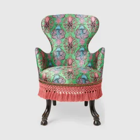 天马行空的扶手椅,配以描绘章鱼和水母等海洋生物的提花蒙皮。坐垫周围饰有编织系结流苏,配合黄铜钉头,突显轮廓造型。章鱼和水母提花蒙皮。 棕漆山毛榉木。 粉色流苏滚边 。 本品定制生产,一经销售,不予退换。下订单后,无法取消。。 57 厘米(宽)x 59 厘米(深)x 86 厘米(高)。 88%聚酯纤维,7%桑蚕丝,5%尼龙。 意大利创作。 请注意,本件商品不提供礼品包装。