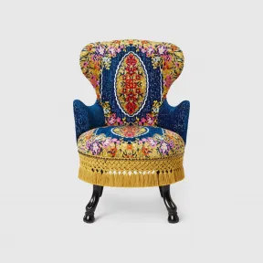 由亚历山卓•米开理设计的全新“罗马印记”系列家具和装饰作品,借鉴了成衣系列的主题和图案。这款扶手椅采用质感奢华的蓝色天鹅绒匠心制作,精美的花卉提花图案呈现传统织锦面料的精致繁复之美,双G标志性符号与中央图案元素相映成趣,亮眼的编织系结流苏巧妙装饰椅座,各种元素令整款设计流露出异想天开的设计感。正面蓝色天鹅绒花卉提花,背面云纹织物。 黑漆木材。 流苏滚边。 定制产品一经销售,不予退换。下单后,订单将无法取消。。 57 厘米(宽)x 59 厘米(深)x 86 厘米(高)。 正面:51%粘胶纤维,30%棉,11聚酯纤维,8%腈纶;背面:110% Trevira CS。 意大利创作。