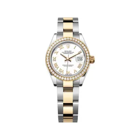 宝石镶嵌工匠,如同雕塑家使用珍贵金属为每颗宝石手工精心打造其镶座。工匠以极其精准的技艺为宝石进行镶嵌,每颗宝石均精确地排列和校准于所属位置,确保牢固地装饰于金或铂金的镶座上。除了对宝石品质的讲究外,劳力士在宝石镶嵌上亦有其他严格的要求,当中包括宝石的高度及其精确排列、方向与位置、镶嵌的规律性、坚固度和比例、以及金属镶座的精致表面修饰。腕表为佩戴者的手腕带来璀璨耀目的点缀。宝石镶嵌工匠,如同雕塑家使用珍贵金属为每颗宝石手工精心打造其镶座。工匠以极其精准的技艺为宝石进行镶嵌,每颗宝石均精确地排列和校准于所属位置,确保牢固地装饰于金或铂金的镶座上。 除了对宝石品质的讲究外,劳力士在宝石镶嵌上亦有其他严格的要求,当中包括宝石的高度及其精确排列、方向与位置、镶嵌的规律性、坚固度和比例、以及金属镶座的精致表面修饰。腕表为佩戴者的手腕带来璀璨耀目的点缀。|漆面几乎能够产生无限色调、强度及光滑度。漆面技术包括在黄铜底板上连续沉积六层薄漆。再喷上无色光漆,使色调或色度更加深邃亮丽。待光漆风干后,表盘会经抛光处理,绽放色彩,然后再进行移印及镶饰标记。漆面几乎能够产生无限色调、强度及光滑度。漆面技术包括在黄铜底板上连续沉积六层薄漆。 再喷上无色光漆,使色调或色度更加深邃亮丽。待光漆风干后,表盘会经抛光处理,绽放色彩,然后再进行移印及镶饰标记。|金,亮丽高贵,教人着迷。钢,坚固无比,可堪信赖。两者和谐融汇,与其他特性巧妙结合。金钢是劳力士的标志特色,早于1930年代初已配置在劳力士表款之中,至1933年正式注册商标名称。这亦是蚝式恒动系列其中一个显著的特征。金,亮丽高贵,教人着迷。钢,坚固无比,可堪信赖。两者和谐融汇,与其他特性巧妙结合。 金钢是劳力士的标志特色,早于1930年代初已配置在劳力士表款之中,至1933年正式注册商标名称。这亦是蚝式恒动系列其中一个显著的特征。|蚝式(Oyster)表带坚固舒适,集造型、功能、美学及技术于一体。表带配备蚝式带扣,亦配备同样是劳力士独有的易调链节延展系统。佩戴者可运用此劳力士独有的巧妙装置,将表带延长约5 MM,在任何情况下均倍感舒适。蚝式(Oyster)表带坚固舒适,集造型、功能、美学及技术于一体。 表带配备蚝式带扣,亦配备同样是劳力士独有的易调链节延展系统。佩戴者可运用此劳力士独有的巧妙装置,将表带延长约5 MM,在任何情况下均倍感舒适。|小窗凸透镜不仅是劳力士腕表的一大特色,且易于识别。小窗凸透镜的名字源于希腊神话的独眼巨人。此装置将腕表标志的日历显示放大,让人一目了然。一如劳力士腕表的其他特色,小窗凸透镜是多年研发创新的成果,体现品牌力求完善的精神。小窗凸透镜不仅是劳力士腕表的一大特色,且易于识别。 小窗凸透镜的名字源于希腊神话的独眼巨人。此装置将腕表标志的日历显示放大,让人一目了然。一如劳力士腕表的其他特色,小窗凸透镜是多年研发创新的成果,体现品牌力求完善的精神。|新一代2236型自动上链机械机芯全由劳力士研发制造。机芯内置劳力士专利Syloxi硅游丝,确保腕表具有超卓天文台精密时计性能。Syloxi游丝不受磁场干扰,即使面对温度变化,依然极为稳定,其抗震力更比传统游丝高出十倍。其专利几何结构使机芯在任何位置都可保持规律运行。新一代2236型自动上链机械机芯全由劳力士研发制造。机芯内置劳力士专利Syloxi硅游丝,确保腕表具有超卓天文台精密时计性能。 Syloxi游丝不受磁场干扰,即使面对温度变化,依然极为稳定,其抗震力更比传统游丝高出十倍。其专利几何结构使机芯在任何位置都可保持规律运行。 表壳:蚝式,28 MM,钻石、黄金及蚝式钢|蚝式表壳结构:一体成型中层表壳,旋入式底盖及上链表冠|直径:28 MM|材质:黄金钢(蚝式钢与黄金的组合)|外圈:镶钻石|上链表冠:旋入式,双扣锁双重防水系统|镜面:防刮损蓝水晶,小窗凸透镜放大日历|防水深度:防水深达100米/330英尺||机芯机芯:自动上链机械恒动机芯|机芯型号:劳力士2236型机芯|精准:每天平均正负两秒以内(机芯装进表壳后)|功能:中央时、分及秒针;快调瞬跳日历;秒针暂停功能以准确调校时间|游丝摆轮组件:专利几何结构Syloxi硅游丝;高性能Paraflex缓震装置|上链:藉恒动摆陀双向自动上链|动力储备:约55小时||表带表带:蚝式(Oyster),三格实心链节|材质:黄金钢(蚝式钢与黄金的组合)|带扣:摺叠蚝式带扣配5 MM易调链节延展系统||表盘表盘:白色||认证认证:超卓天文台精密时计认证:瑞士天文台认证(COSC)+ 劳力士认证(机芯装进表壳后)||