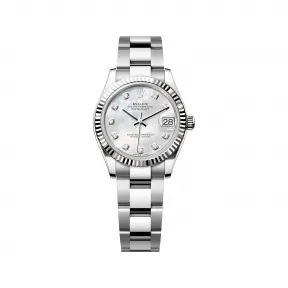 表盘设有18K金底座镶托钻石。珍珠母是神秘魅力与愉悦惊喜的象征。根据不同来源,珍珠母可能是粉红色、白色、黑色或黄色。它的色泽深浅及结构亦可按在贝壳哪部分取出而有别。劳力士决不选用人工着色的珍珠母。相反,品牌工匠凭借非凡精湛的技艺,为珍珠母绽放其天然美态及保留原有的色泽。每枚珍珠母表盘均独一无二,与众不同。表盘设有18K金底座镶托钻石。珍珠母是神秘魅力与愉悦惊喜的象征。根据不同来源,珍珠母可能是粉红色、白色、黑色或黄色。它的色泽深浅及结构亦可按在贝壳哪部分取出而有别。 劳力士决不选用人工着色的珍珠母。相反,品牌工匠凭借非凡精湛的技艺,为珍珠母绽放其天然美态及保留原有的色泽。每枚珍珠母表盘均独一无二,与众不同。|劳力士三角坑纹为品牌腕表的特色。最初,蚝式腕表外圈上的三角坑纹具备实际用途,有助将外圈旋紧固定在表壳上,确保腕表的防水性能。而底盖上可见的坑纹设计亦出于同样目的,并以特定的劳力士工具旋紧于表壳。及后,三角坑纹演变为一项美学设计元素,堪为劳力士的经典特色。时至今日,三角坑纹成为品牌腕表的特色,这款日志型 31的外圈以金制成。劳力士三角坑纹为品牌腕表的特色。最初,蚝式腕表外圈上的三角坑纹具备实际用途,有助将外圈旋紧固定在表壳上,确保腕表的防水性能。 而底盖上可见的坑纹设计亦出于同样目的,并以特定的劳力士工具旋紧于表壳。及后,三角坑纹演变为一项美学设计元素,堪为劳力士的经典特色。时至今日,三角坑纹成为品牌腕表的特色,这款日志型 31的外圈以金制成。|金,亮丽高贵,教人着迷。钢,坚固无比,可堪信赖。两者和谐融汇,与其他特性巧妙结合。金钢是劳力士的标志特色,早于1930年代初已配置在劳力士表款之中,至1933年正式注册商标名称。这亦是蚝式恒动系列其中一个显著的特征。金,亮丽高贵,教人着迷。钢,坚固无比,可堪信赖。两者和谐融汇,与其他特性巧妙结合。 金钢是劳力士的标志特色,早于1930年代初已配置在劳力士表款之中,至1933年正式注册商标名称。这亦是蚝式恒动系列其中一个显著的特征。|蚝式(Oyster)表带坚固舒适,集造型、功能、美学及技术于一体。表带配备蚝式带扣,亦配备同样是劳力士独有的易调链节延展系统。佩戴者可运用此劳力士独有的巧妙装置,将表带延长约5 MM,在任何情况下均倍感舒适。蚝式(Oyster)表带坚固舒适,集造型、功能、美学及技术于一体。 表带配备蚝式带扣,亦配备同样是劳力士独有的易调链节延展系统。佩戴者可运用此劳力士独有的巧妙装置,将表带延长约5 MM,在任何情况下均倍感舒适。|小窗凸透镜不仅是劳力士腕表的一大特色,且易于识别。小窗凸透镜的名字源于希腊神话的独眼巨人。此装置将腕表标志的日历显示放大,让人一目了然。一如劳力士腕表的其他特色,小窗凸透镜是多年研发创新的成果,体现品牌力求完善的精神。小窗凸透镜不仅是劳力士腕表的一大特色,且易于识别。 小窗凸透镜的名字源于希腊神话的独眼巨人。此装置将腕表标志的日历显示放大,让人一目了然。一如劳力士腕表的其他特色,小窗凸透镜是多年研发创新的成果,体现品牌力求完善的精神。|新一代2236型自动上链机械机芯全由劳力士研发制造。机芯内置劳力士专利Syloxi硅游丝,确保腕表具有超卓天文台精密时计性能。Syloxi游丝不受磁场干扰,即使面对温度变化,依然极为稳定,其抗震力更比传统游丝高出十倍。其专利几何结构使机芯在任何位置都可保持规律运行。新一代2236型自动上链机械机芯全由劳力士研发制造。机芯内置劳力士专利Syloxi硅游丝,确保腕表具有超卓天文台精密时计性能。 Syloxi游丝不受磁场干扰,即使面对温度变化,依然极为稳定,其抗震力更比传统游丝高出十倍。其专利几何结构使机芯在任何位置都可保持规律运行。 表壳:蚝式,31 MM,白色黄金及蚝式钢|蚝式表壳结构:一体成型中层表壳,旋入式底盖及上链表冠|直径:31 MM|材质:白色黄金钢(蚝式钢与白色黄金的组合)|外圈:三角坑纹|上链表冠:旋入式,双扣锁双重防水系统|镜面:防刮损蓝水晶,小窗凸透镜放大日历|防水深度:防水深达100米/330英尺||机芯机芯:自动上链机械恒动机芯|机芯型号:劳力士2236型机芯|精准:每天平均正负两秒以内(机芯装进表壳后)|功能:中央时、分及秒针;快调瞬跳日历;秒针暂停功能以准确调校时间|游丝摆轮组件:专利几何结构Syloxi硅游丝;高性能Paraflex缓震装置|上链:藉恒动摆陀双向自动上链|动力储备:约55小时||表带表带:蚝式(Oyster),三格实心链节|材质:蚝式钢|带扣:摺叠蚝式带扣配5 MM易调链节延展系统||表盘表盘:白色珍珠母,镶钻石|宝石镶嵌:18K金,镶钻石||认证认证:超卓天文台精密时计认证:瑞士天文台认证(COSC)+ 劳力士认证(机芯装进表壳后)||