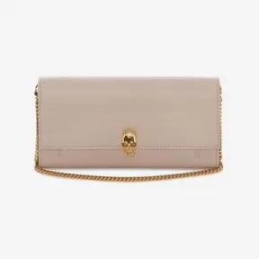 肉粉色小号粒纹小牛皮钱夹,配有一个可脱卸斜挎链饰,正面金属骷髅扣开合,点缀施华洛世奇水晶。内设 1 个正面口袋、2 个主隔层、正中 1 个金属拉链口袋及皮革拉链袢、1 个手机袋、1 个扁平口袋、6 个卡槽。光泽金色黄铜硬件。