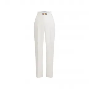 本款西装裤采用科技华达呢剪裁直筒版型,以灿若珠宝的金属搭扣点缀门襟,再令 LV 铭纹纽扣栖身后中束带圈,焕新演绎经典设计。