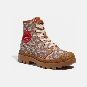 *精选专门店 香港美丽华广场/香港国际金融中心商场/澳门四季名店 限定贩售。Coach 推出此灵感来自普普艺术的趣味联名系列,向纽约传奇艺术家 Tom Wesselmann 致敬。本款 Trooper 中筒靴既精致又粗犷,灵感来自军装风单品,是款适合日常外出行走时选穿的鞋履。中筒靴采鞋带闭合设计,缀有抢眼大胆的嘴唇图案,是以奢华皮革与经典 Signature 缇花面料打造而成。经典 Signature 缇花面料是以有机棉与回收聚酯纤维混纺制成,履行我们对环保与永续的承诺,耐穿耐走的橡胶轮胎鞋底则提供绝佳抓地力与舒适度。 关於艺术家:Tom Wesselmann 的作品以鲜艳浓郁的色彩见长,画作的规模都比实物还要巨大,他被视为二十世纪最活跃、最有生命力的其中一位美国艺术家。Wesselmann 抗拒抽象的表现主义,选择以鲜明抢眼的方式来描摹女性躯体、静物以及风景,特别喜欢探索日常生活中不平凡的细节。 | 经典 Signature 缇花面料与皮革鞋面| 布面鞋内里与鞋垫| 橡胶外鞋底| 鞋带闭合设计| Coach x Tom Wesselmann| © 版权归 Tom Wesselmann 所有,由纽约 Artestar 授权