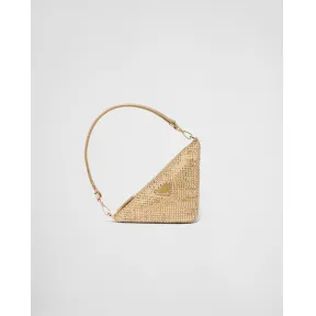 A study on the triangle inspires new geometric shapes and unique interpretations of Prada's historical code. The iconic shape is revived in this satin bag with sleek lines, entirely decorated with luminous crystals for a refined touch. The enameled metal triangle logo enhances the minimalist aesthetic. Product code: 1BC190_2AWL_F0522_V_YOO| With all-over synthetic crystals| Detachable adjustable leather handle| Detachable chain handle| Metal hardware| Enameled metal triangle logo on the front| Zipper closure| Silk satin lining| Height: 14cm| Length: 6cm|