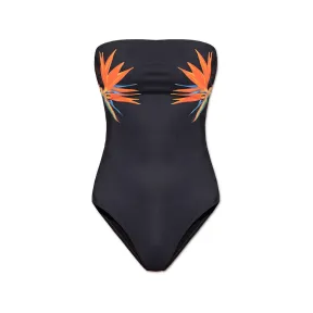 黑色连体泳衣。领口采用搭扣固定,饰有彩色印花。