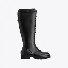 光面皮革系带军靴,靴长及小腿,靴筒背面拉链开合。后跟个性化 Love Birds 金属徽标。皮革衬里。4.5 厘米高跟防水台锯齿状橡胶鞋底。